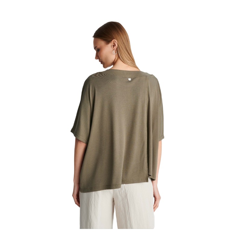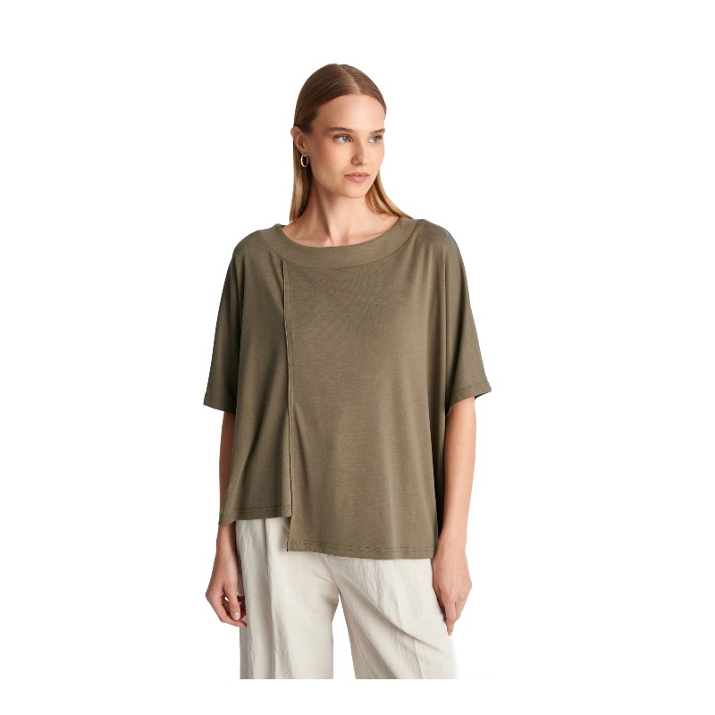 Ασύμμετρη μπλούζα με κοντό μανίκι σε χακί χρώμα, με χαλαρή εφαρμογή και μοντέρνο σχεδιασμό ιδανική για casual εμφανίσεις